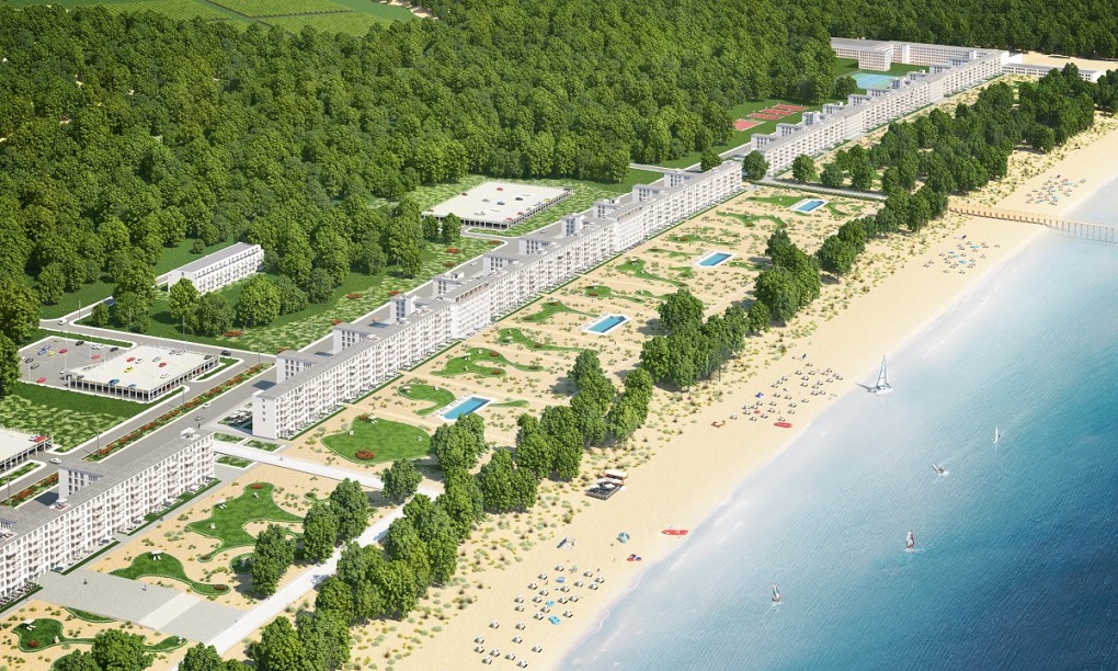 The beach resort of Prora, on the island of Rügen, Germany, is known for 8 abandoned large structures, part of a Nazi-planned tourism project. Hitler envisioned an ambitious plan for a gigantic beach resort, the "most mighty and large one to ever have existed", under the ideal that every worker deserved a holiday in the sun. The resort would hold 20,000 beds, and in the middle a huge building was to be erected. The resort had to be convertible into a military hospital in the event of war.