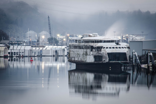 After her retirement, she was sold to a seafood processing company and towed to Alaska to work as a factory ship. In the 1970's, Kalakala was beached in Kodiak and was used to process shrimp. During that time the ship's internal structure was reworked to create a building with cement floors, drywall, and ceiling tiles. After left abandoned for years, Kalakala was refloated and towed back to Seattle in 1998 but its new owner didn't have enough money to maintain the ship. In 2004, a new owner moved her to Neah Bay and then to Tacoma, Washington but plans to restore the ship failed once more. In 2011, the Coast Guard declared the ship a hazard to navigation and in 2012 a yet another new owner bought it for just $4,000. MV Kalakala was finally scrapped in early 2015.
